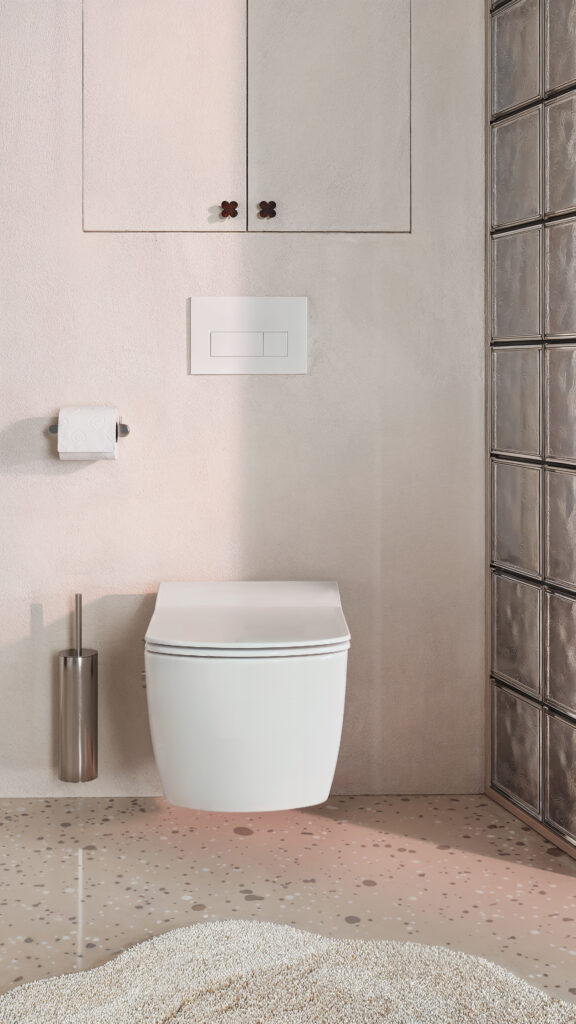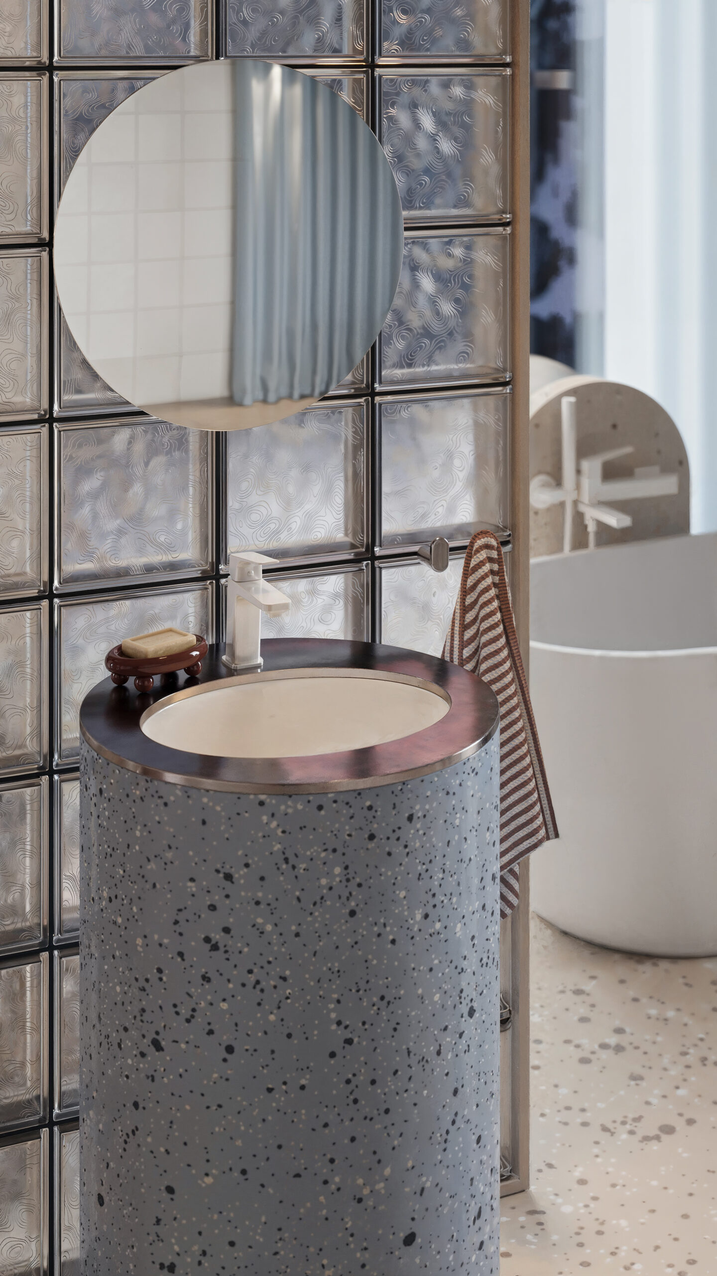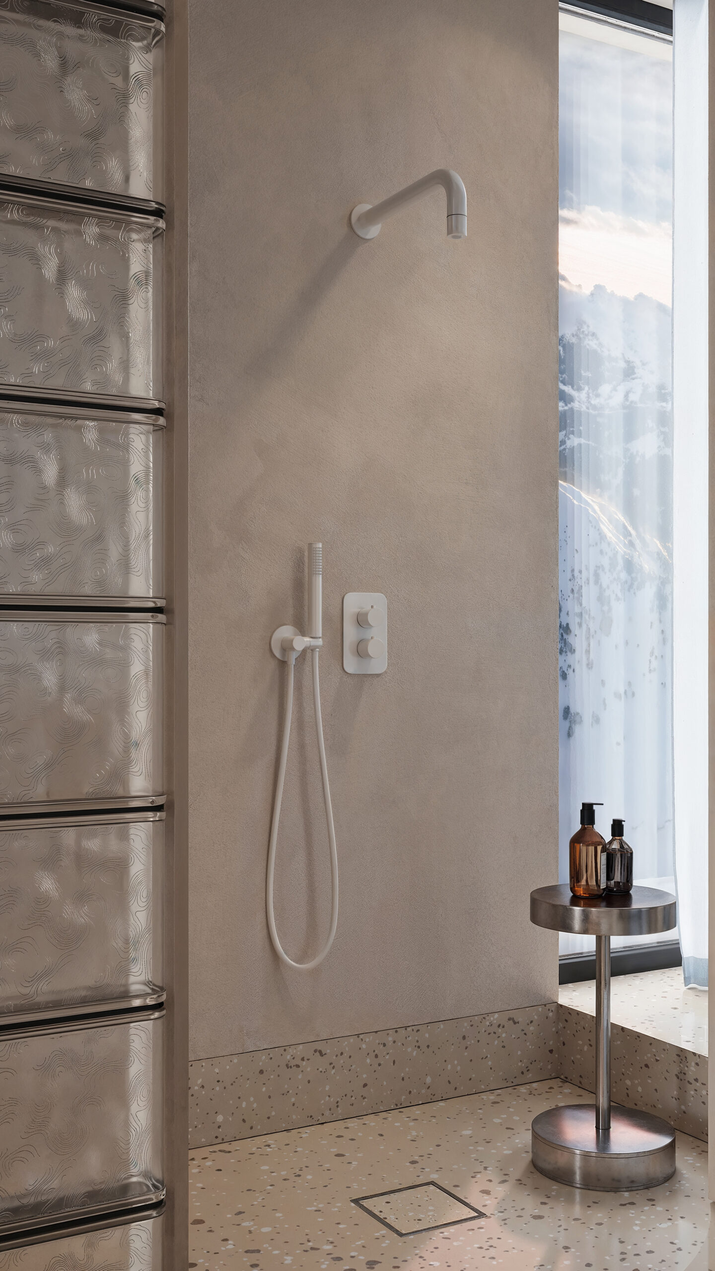 A refined interior concept created for the Deante “Innovative Bathroom” Competition, featuring a serene, contemporary space defined by soft mineral textures, curved architecture, and translucent glass-block partitions. The design blends sculptural terrazzo surfaces with minimalist fixtures, a freestanding bathtub overlooking a panoramic mountain view, and a calm, spa-like atmosphere that highlights modern functionality through subtle, integrated details.
