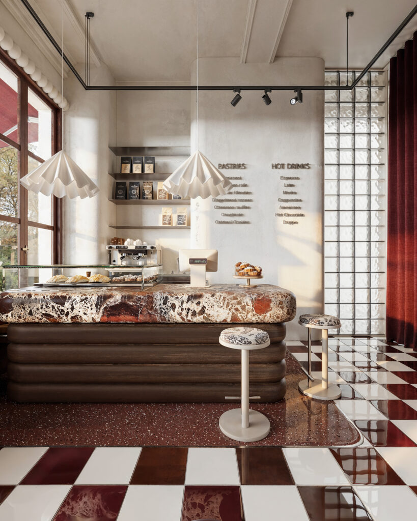 This Parisian café embraces a rich and classic palette, highlighting deep burgundy tones, checkerboard flooring, and dark wood detailing. French-inspired upholstery adds texture and comfort, while terrazzo and stone surfaces bring timeless elegance to the space. Large burgundy-framed windows invite natural light, accentuating the refined materials and creating a welcoming ambiance. The interplay of patterns, textures, and colors — from the checkerboard floor to the luxurious upholstery — balances tradition and contemporary flair, resulting in a café that is both bold and inviting. Every element was carefully curated to convey sophistication and charm, making the interior a memorable and elegant Parisian experience.