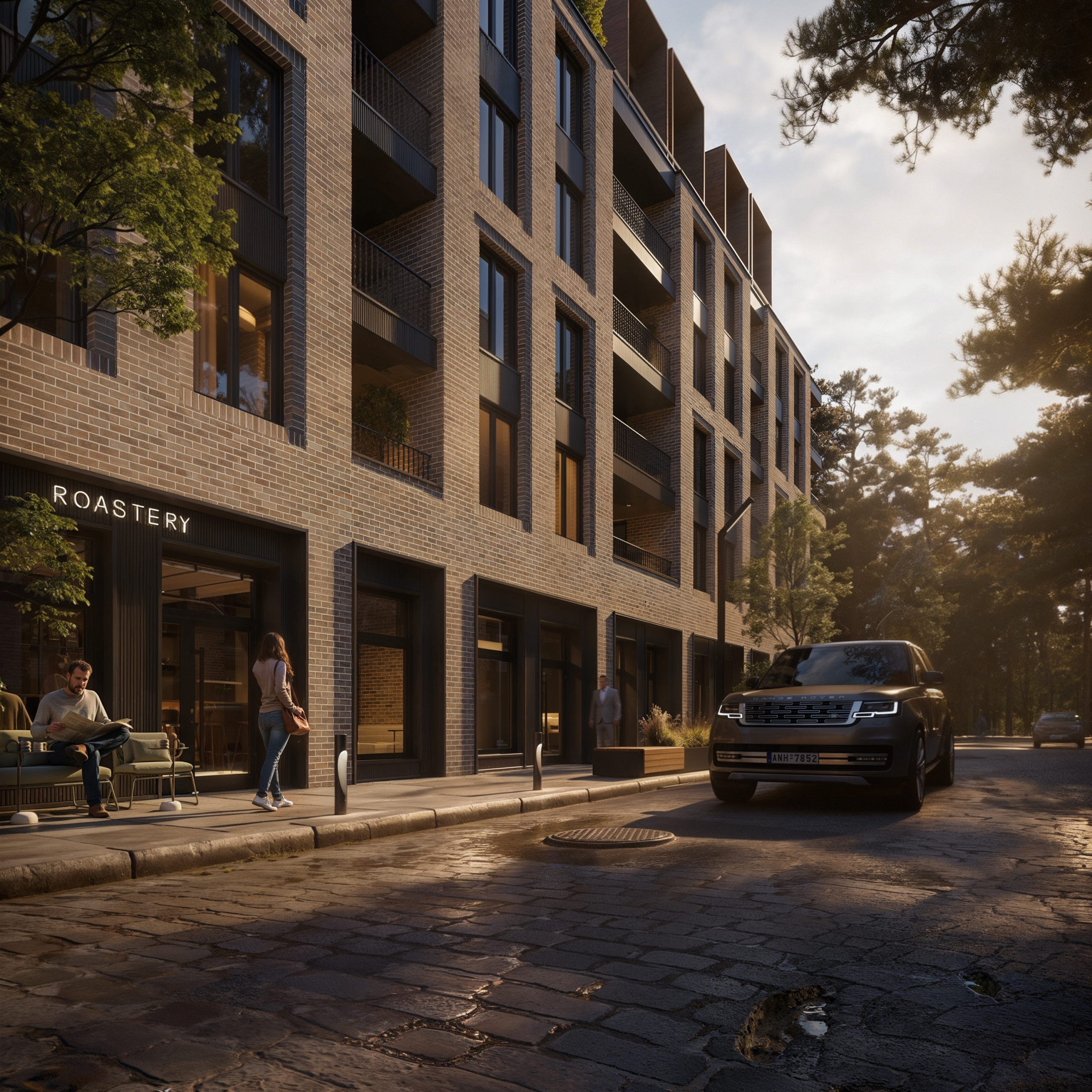 The wet cobblestone street, softened reflections, and natural light create a cinematic atmosphere that enhances the material realism of brick, metal, and glass. Subtle depth of field and carefully refined surface details emphasize the tactile quality of the architecture while maintaining a clean, minimalist aesthetic.