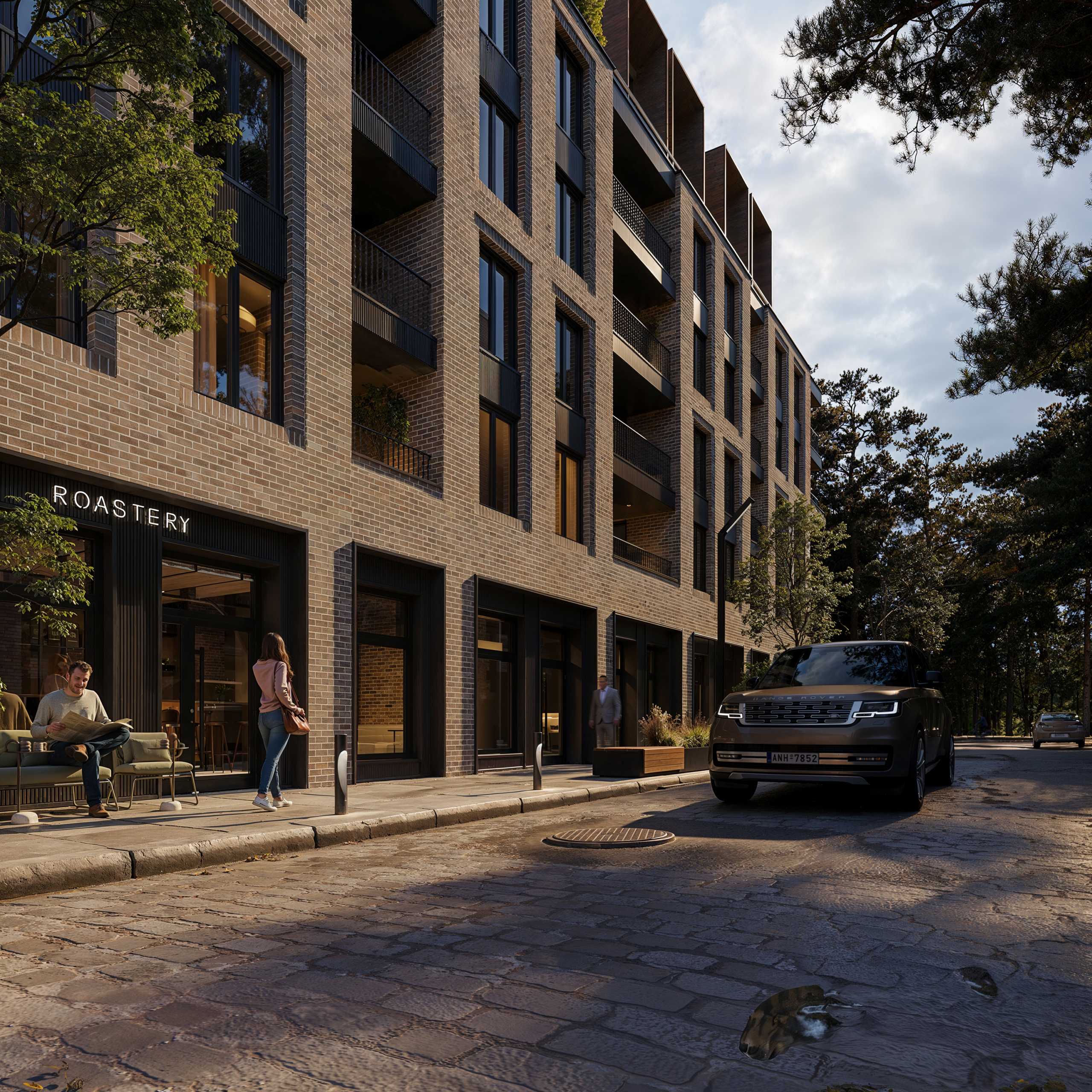 This visualization captures a contemporary residential building in a calm urban setting just after rainfall.