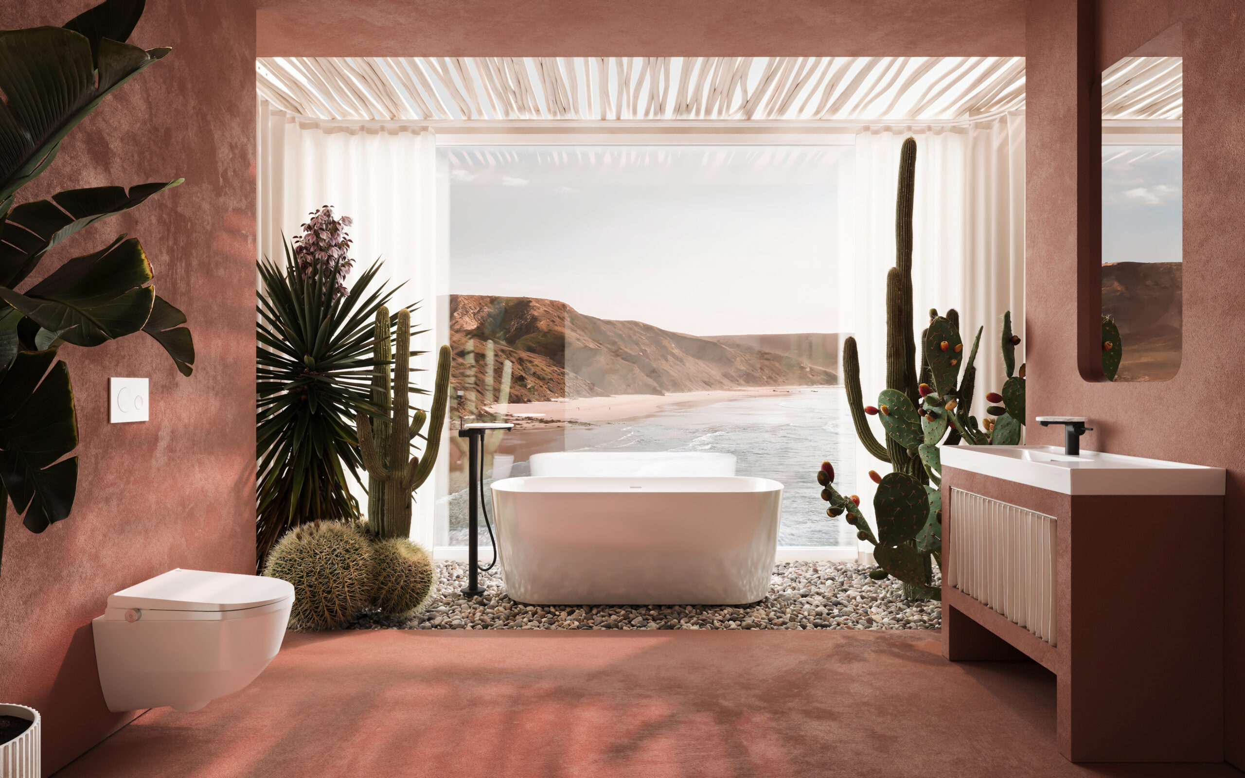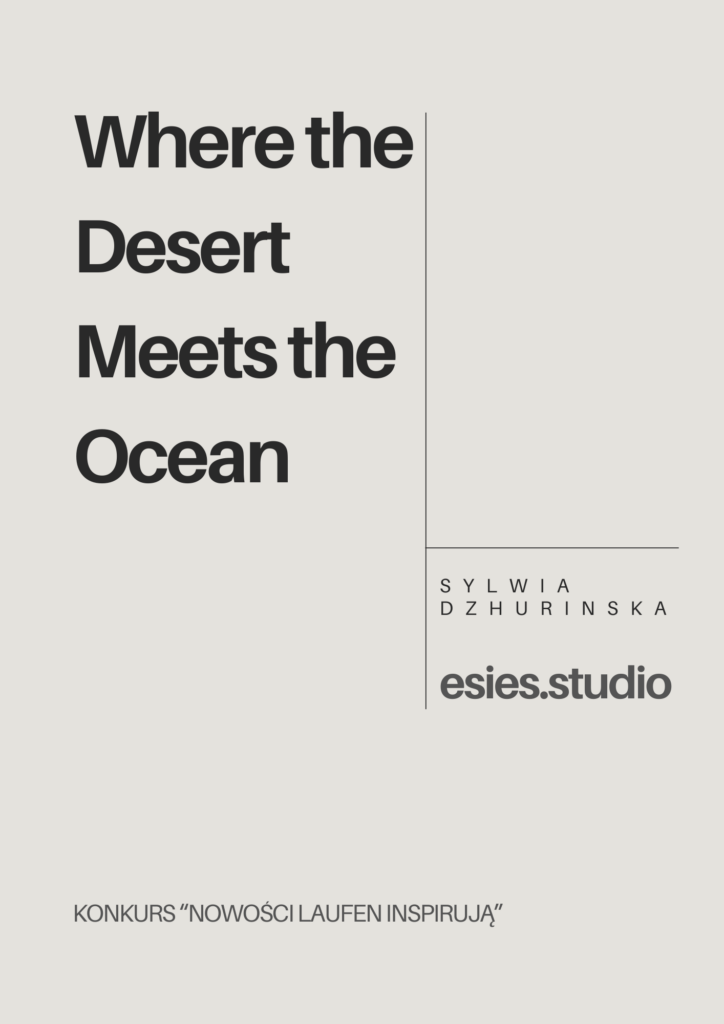 The bathroom “Where the Desert Meets the Ocean” is a competition project for Laufen, inspired by the meeting of Morocco’s rugged, mountainous landscapes with the coastal scenery. The centerpiece is a freestanding bathtub aligned with the horizon – bathing here feels like being “in the landscape,” while a louvered pergola filters the light, creating shifting shadows and a spectacular atmosphere. The interior is complemented by a desert-inspired garden of cacti and succulents, alongside a warm palette of earthy tones. The design combines photographic aesthetics with Airbnb functionality, turning the bathroom into a true destination.